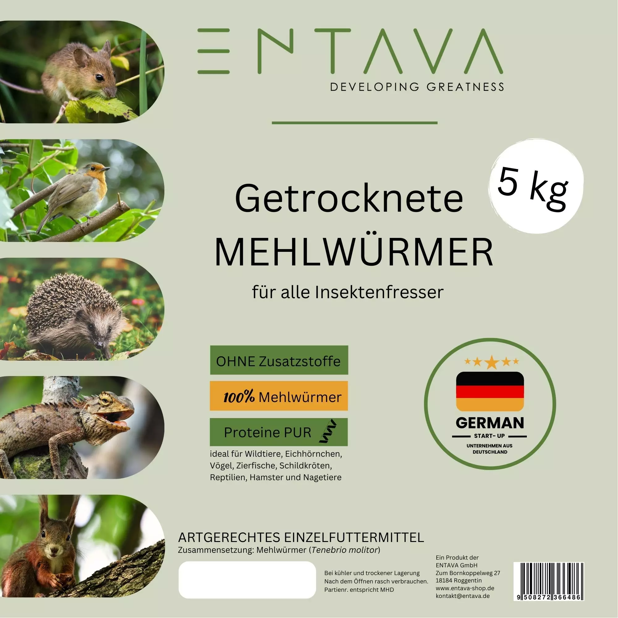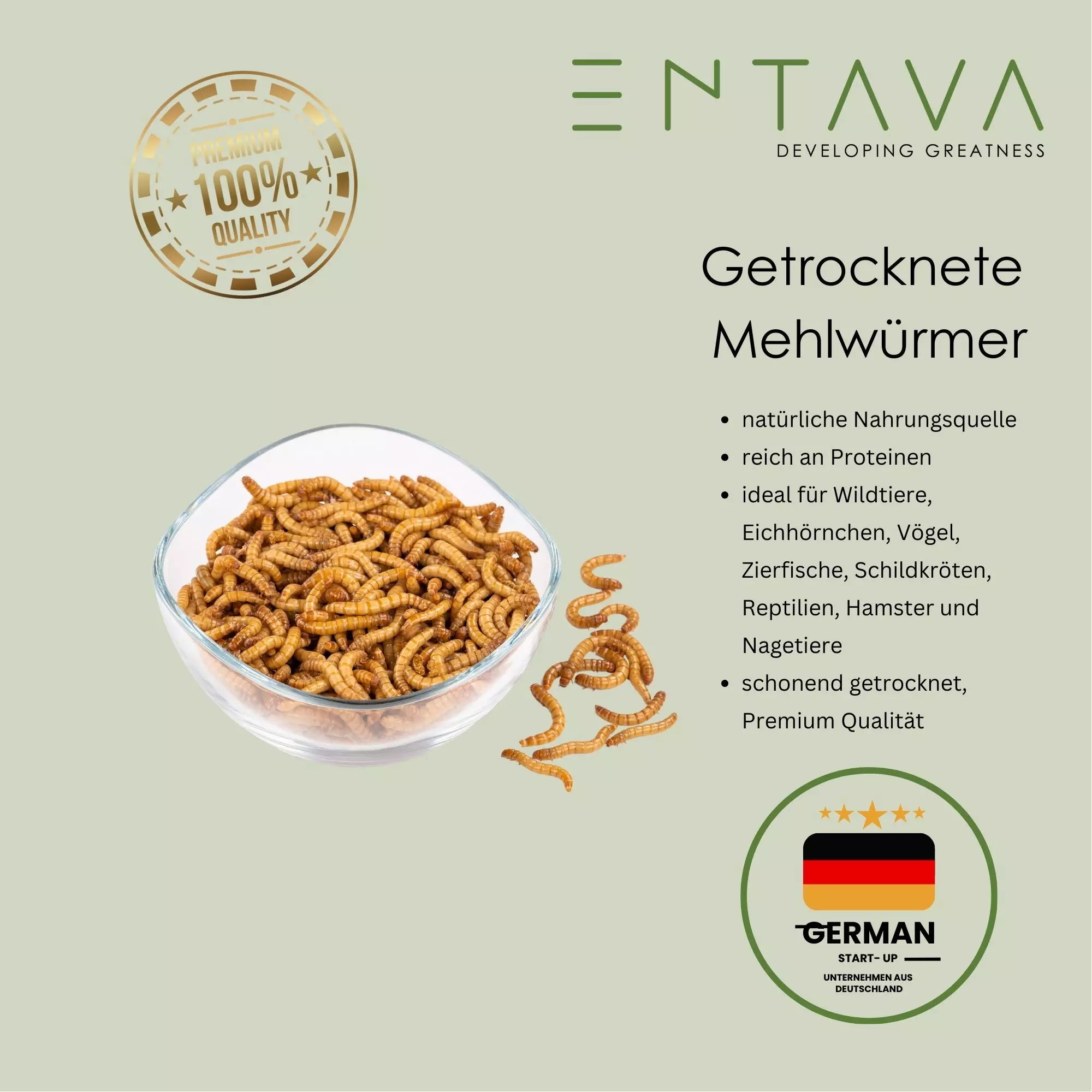 Entdecken Sie die hochwertigen ENTAVA Mehlwürmer - das ideale Einzelfuttermittel für Reptilien, Amphibien, Nager und Vögel! Unsere Mehlwürmer werden sorgfältig in Roggentin bei Rostock gezüchtet und verarbeitet, um höchste Qualität und Frische zu gewährleisten. Besuchen Sie auch gerne unsere Unternehmenswebsite: www.entava.de. In jeder wiederverschließbaren Verpackung erhalten Sie getrocknete Mehlwürmer, die reich an Proteinen sind und eine natürliche Nahrungsquelle für Ihr Haustier bieten. Unsere Futtermittel sind frei von Konservierungsstoffen und Zusatzstoffen, sodass Sie Ihrem Liebling eine gesunde Ernährung bieten können. Gönnen Sie Ihrem Haustier etwas Besonderes mit unseren hochwertigen Mehlwürmern - eine willkommene Abwechslung und ein besonderer Leckerbissen für alle Insektenfresser. Unsere Mehlwürmer sind auch als Ergänzungsfuttermittel für Fische, Vögel, Reptilien und Nager geeignet. Lagern Sie sie kühl und trocken, um ihre Frische zu bewahren.