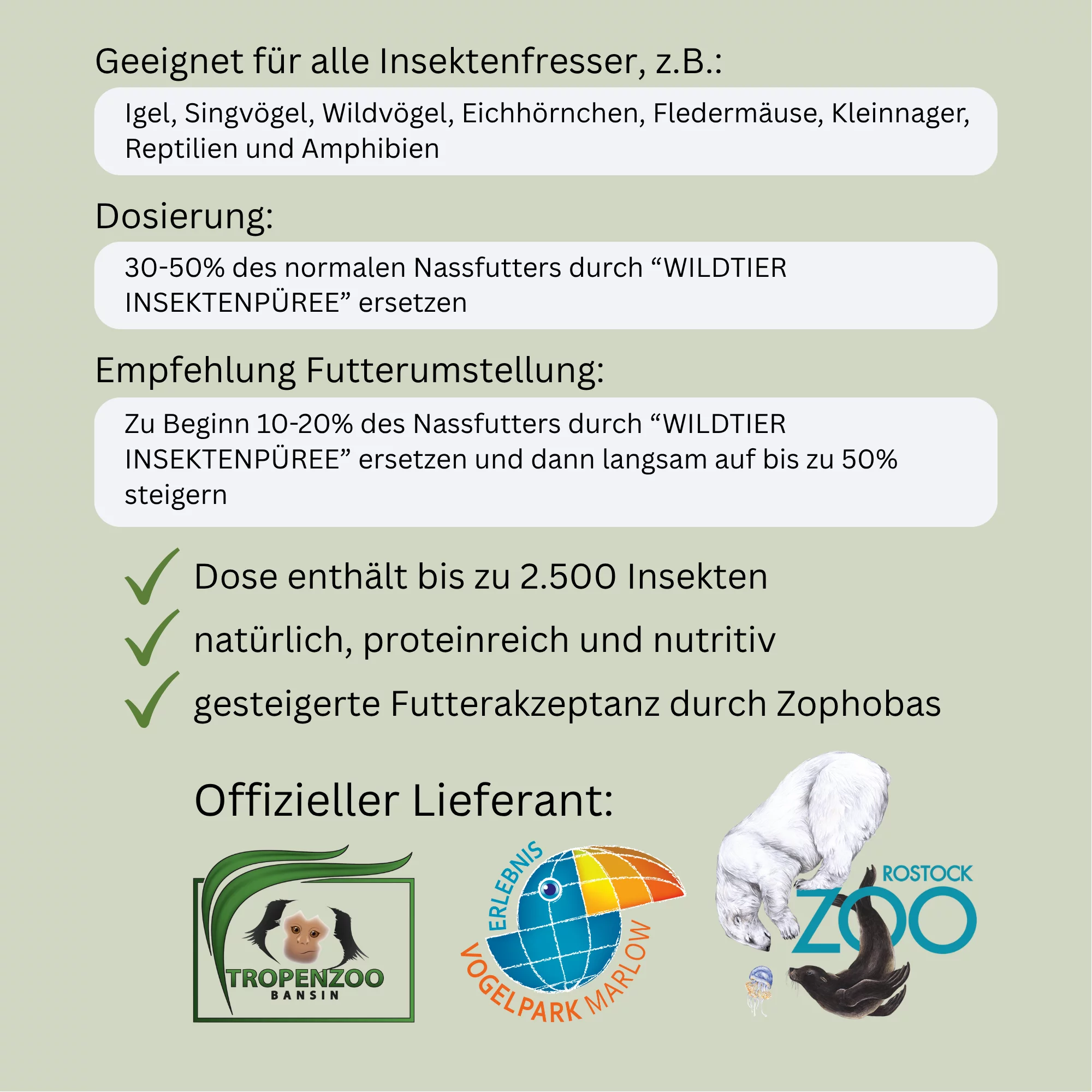 Zu Beginn 10-20% des Nassfutters durch “WILDTIER INSEKTENPÜREE” ersetzen und dann langsam auf bis zu 50% steigern